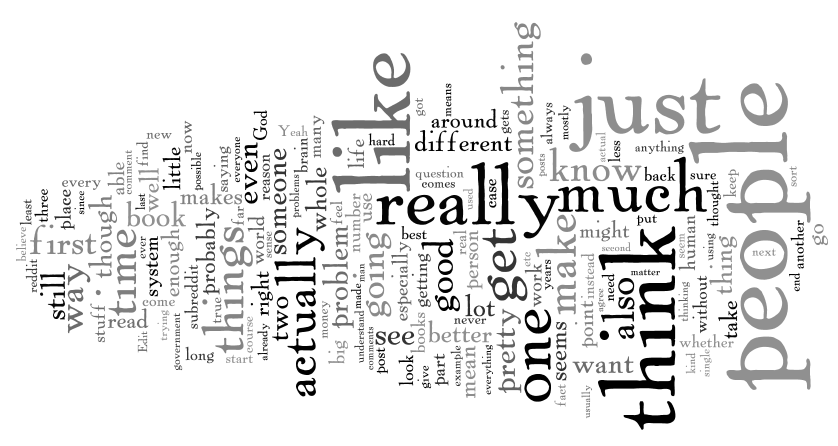 Alright, so I was cruising reddit the other day and found a python script that mines through your comment history and pulls all that information into a text file. I immediately did so. One small downside of this is that only the last three months of comment history are stored for access from your comment history page (the rest being archived into a different database, or different section of the same database), so this is just a snapshot of three months of comments. Once I had the text file, I stripped out all the metadata that the script put in, stripped out all the URLs I had linked in comments, and started on trying to see what I could do with this corpus.
