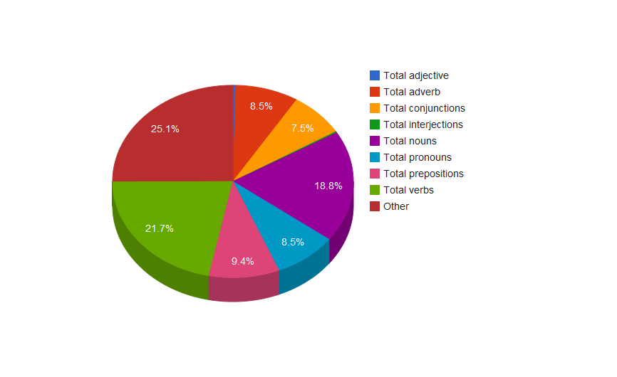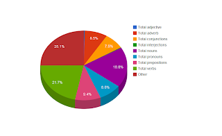 For fun, I ran it through a parts-of-speech tagger which has about a 97% success rate; here’s a table that shows the various categorizations and frequencies of speech. I’ll skip past the part where I had to enter a bunch of information into a spreadsheet and just show you the colorful pie chart: